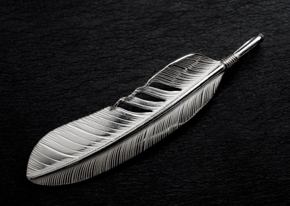 H70mm×W15mm/SILVERインディアンジュエリーの定番、フェザーです。PEACEのフェザーは羽根の模様をひとつひとつ打ち込んでいくという、全工程をハンドメイド行うオンリーワンのフェザーです。左右、大小ありますので好きな形をお選び下さい。※完全受注生産商品となりますので、お届けまでに2~3週間ほど頂いております。この商品に装着可能なチェーンはCL、CL/4C、CLF、BCからお選び頂けます。